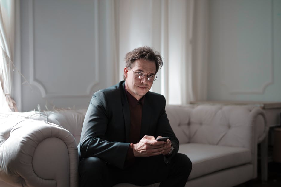 穿着黑色西装,坐在白色的沙发上,用他的手机的男人微笑着的照片 · 免费素材图片