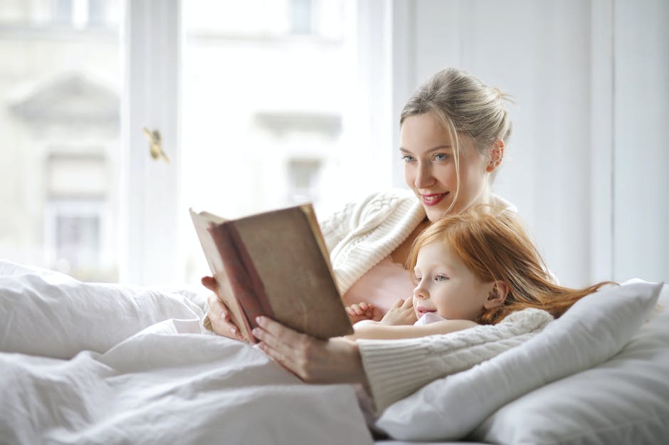 躺在床上微笑的母亲和女儿读书的照片 · 免费素材图片