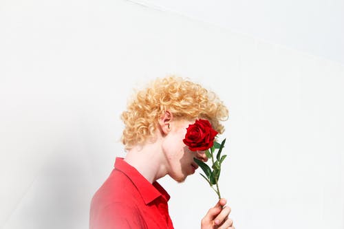 拿着一朵红玫瑰的红顶的男人 · 免费素材图片