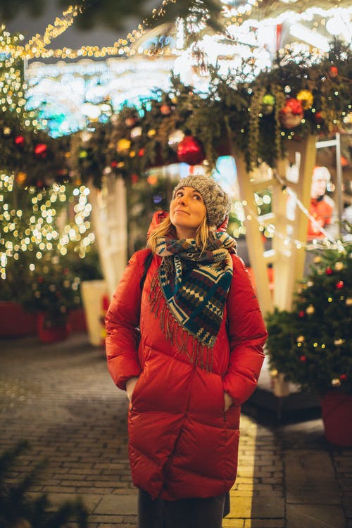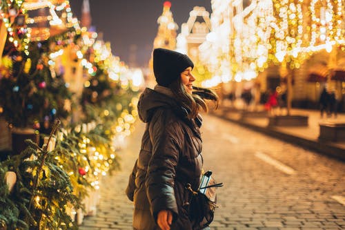 在明亮的背景下微笑时穿着黑色泡泡夹克和无檐小便帽的女人的照片 · 免费素材图片