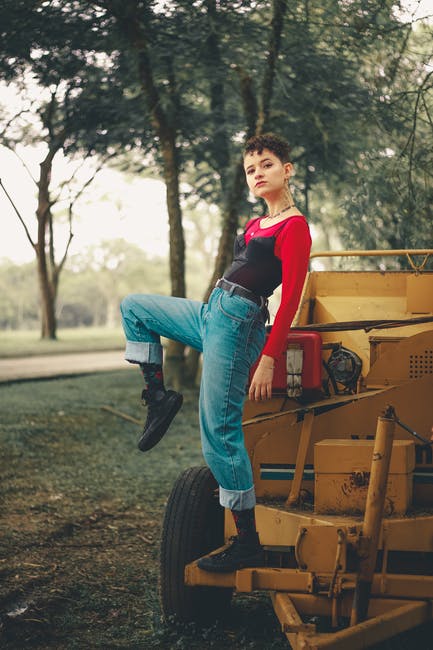 摆在黄色拖拉机上的红顶和蓝色牛仔牛仔裤的女人 · 免费素材图片