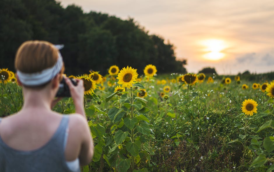 女人拍照的向日葵田 · 免费素材图片