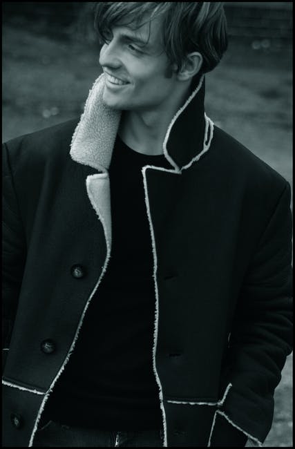 身穿黑色纽扣缺口翻领外套微笑的人的灰度照片 · 免费素材图片
