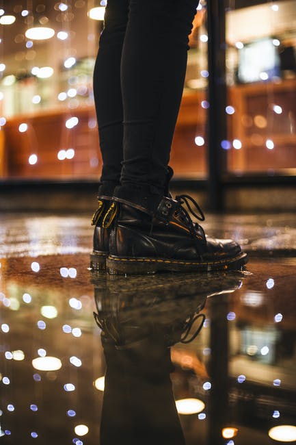 穿着黑色合身牛仔裤和黑色dr.Martens靴子站在黑色地砖上的人的照片 · 免费素材图片