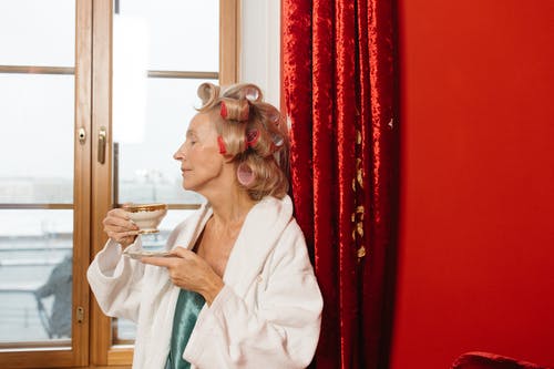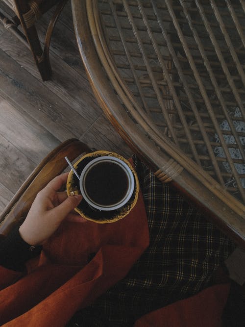 黑色的冷肩礼服,拿着茶杯与茶碟的女人 · 免费素材图片
