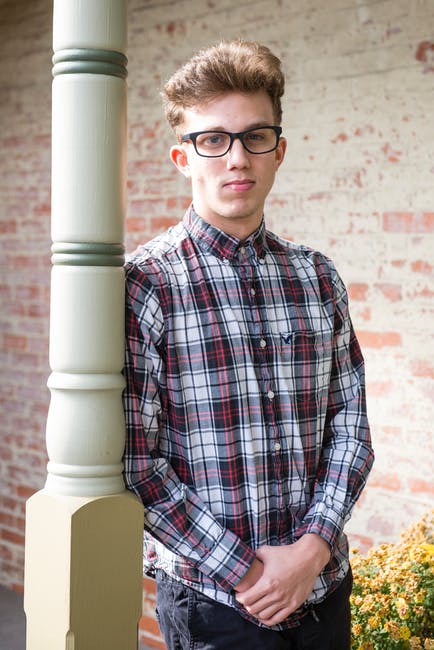 红色的黑色和白色格子印花的衬衫,穿着徒步旅行者眼镜倚在白色的木柱上的男人 · 免费素材图片