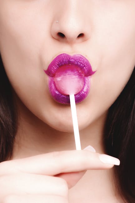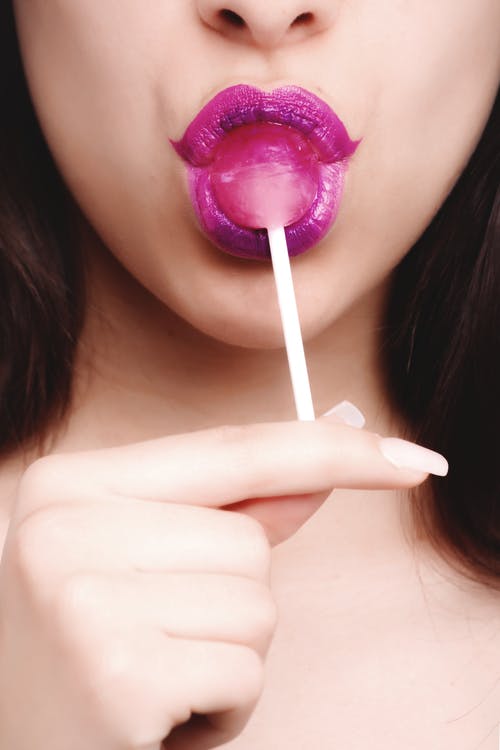 女人穿着紫色唇膏与粉红色的棒棒糖 · 免费素材图片