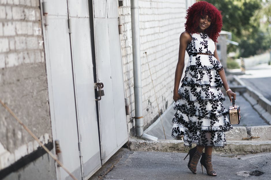 女人穿着白色和黑色的花无袖连衣裙站在粉刷成白色的建筑物旁边 · 免费素材图片