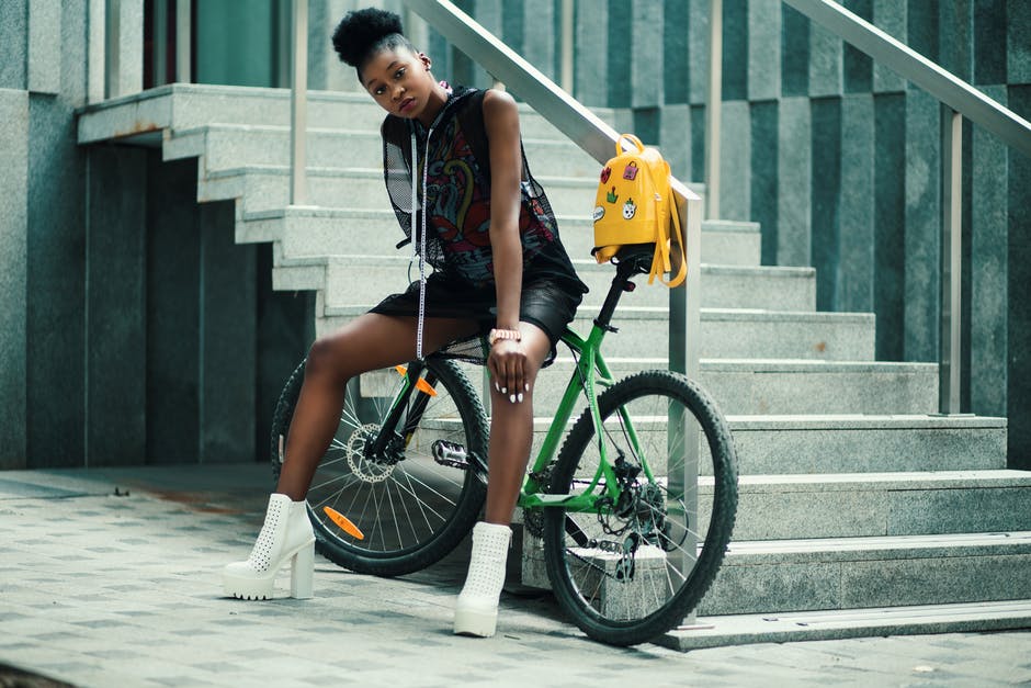 黑色无袖穿裙子坐在绿色的自行车上的女人 · 免费素材图片