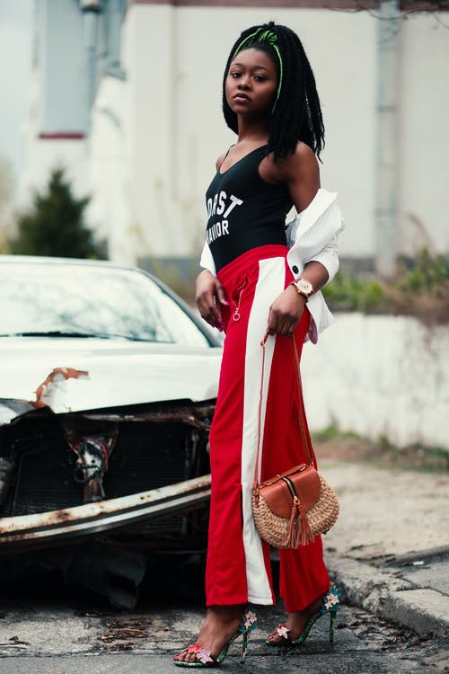 白色打开羊毛衫和红色和白色的裤子,坐在损坏白色车上的女人 · 免费素材图片