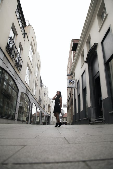 在建筑物之间穿黑色无袖连衣裙的女人 · 免费素材图片