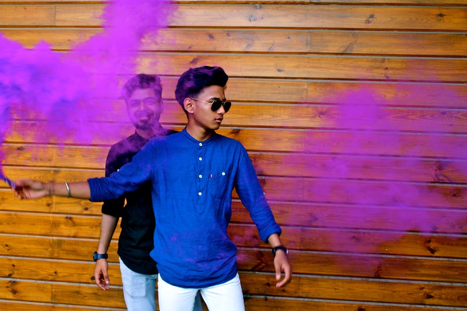 男人穿着蓝色的长袖亨利衬衫和白色的裤子 · 免费素材图片