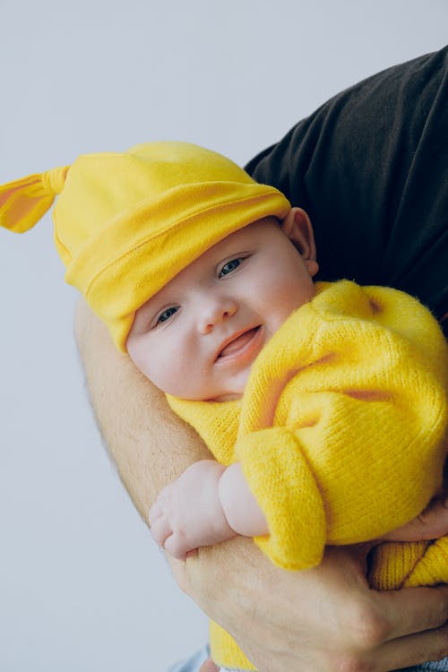 作物人触摸手掌与刚出生的婴儿,在灰色的背景上 · 免费素材图片