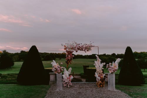 带有绿色植物的房子附近的婚礼标志 · 免费素材图片