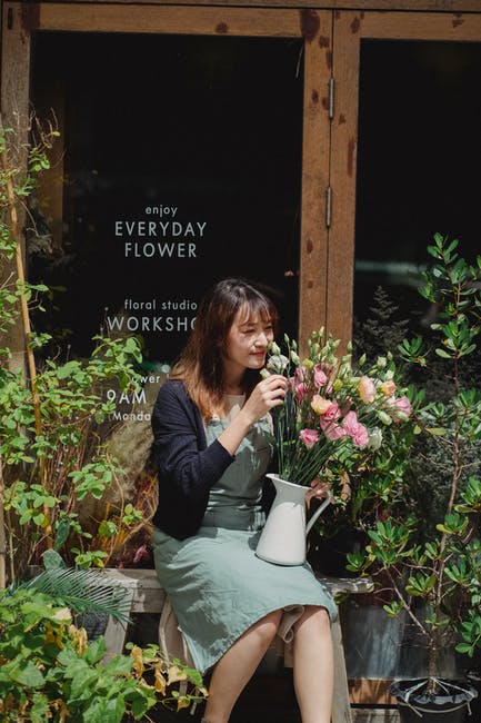 微笑在花束的族裔妇女嗅到的花 · 免费素材图片