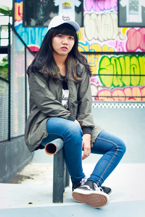 女人穿着白色作物顶部和牛仔夹克走在路面上,手持袋的照片 · 免费素材图片
