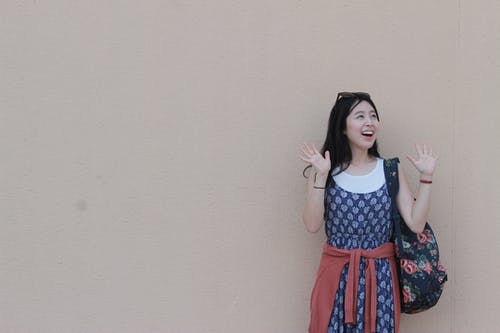 女人穿着粉红色的沉重项链中长裙站在火车站 · 免费素材图片