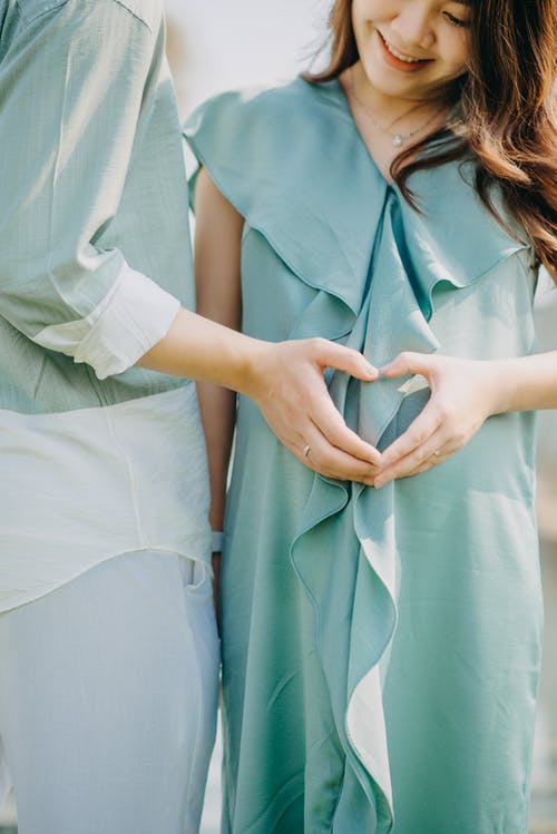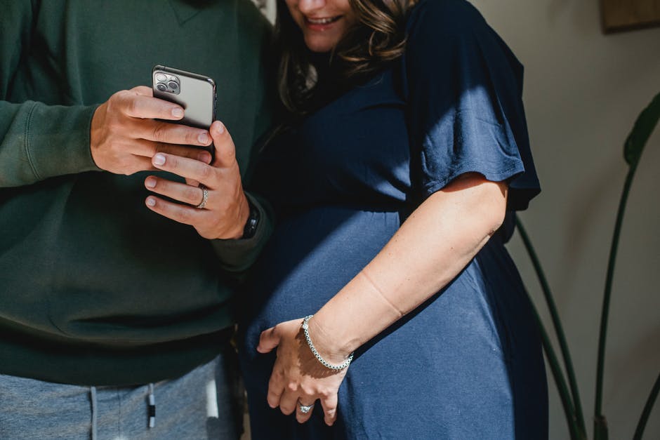 裁剪孕妇和丈夫在家共享智能手机 · 免费素材图片