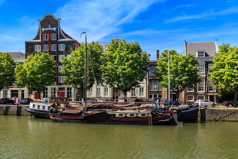 棕色和红色建筑物附近的码头上的帆船 · 免费素材图片