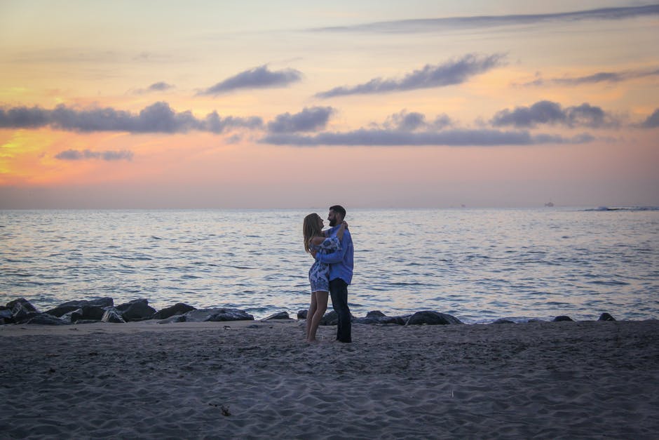黄金时段,情侣在平静的水面附近的海滨站立 · 免费素材图片