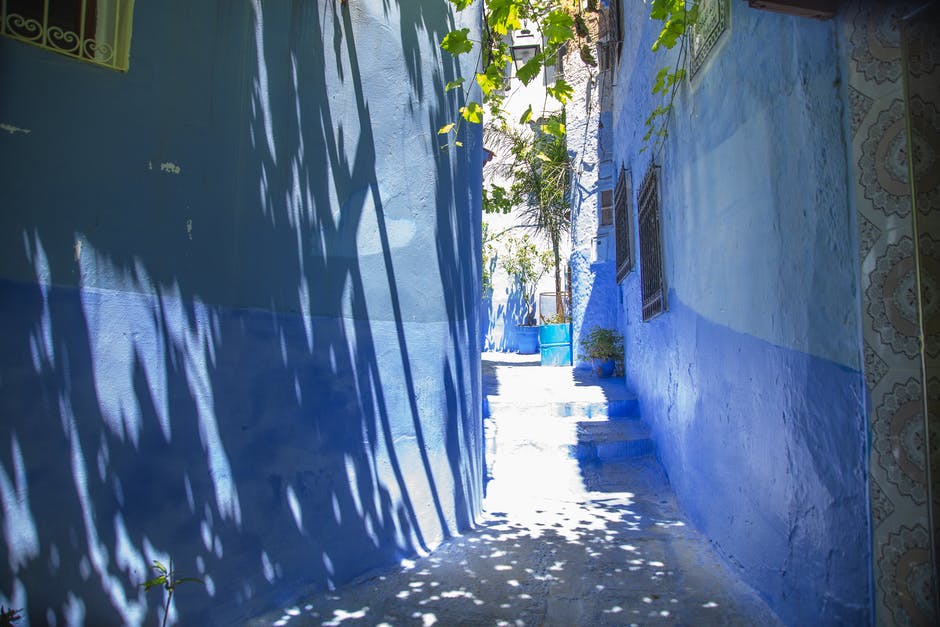 蓝色建筑物之间的狭窄通道 · 免费素材图片