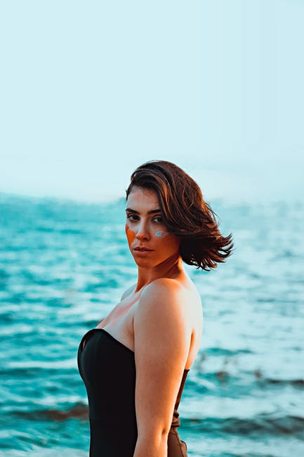 女人在海滩上穿黑色无肩带泳装,脸上涂满颜料 · 免费素材图片