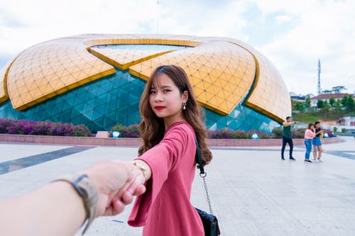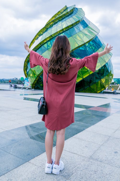 喷泉附近穿红裙子的女人 · 免费素材图片