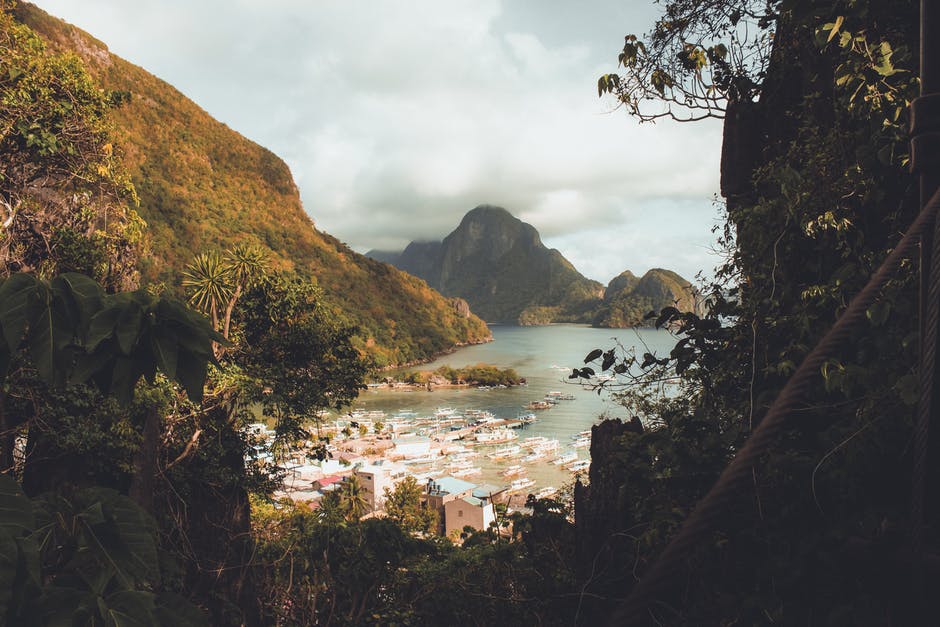 Moutnains包围的水域附近的房屋 · 免费素材图片