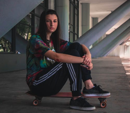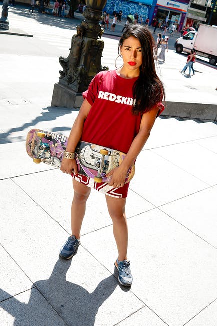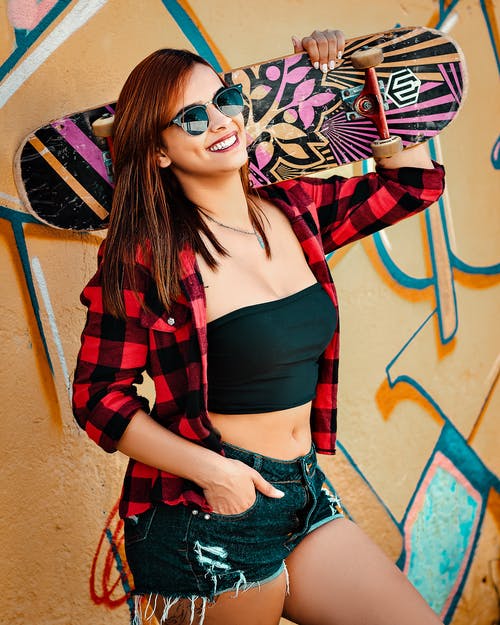 女人穿着红色衬衫拿着滑板 · 免费素材图片