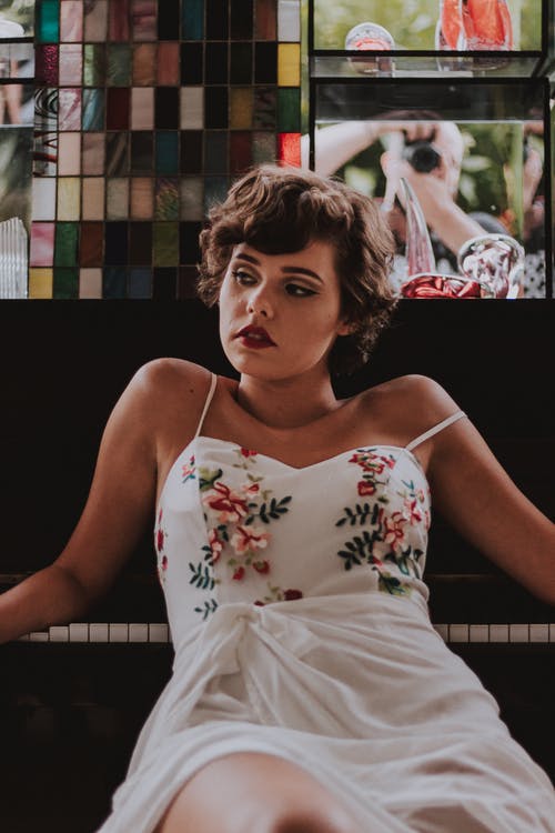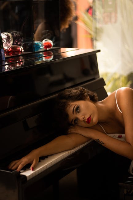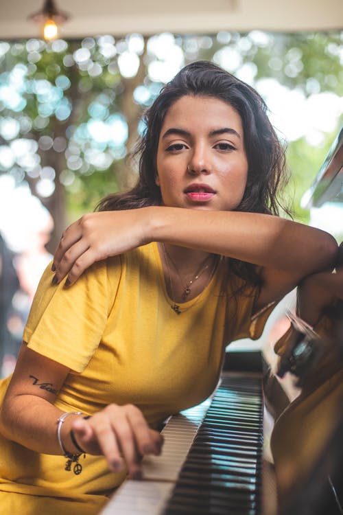 躺在棕色木制钢琴上的女人 · 免费素材图片