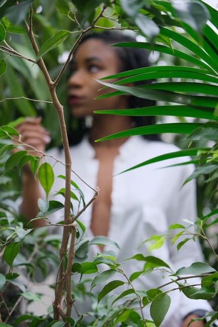 女人穿着白衬衫附近的绿叶植物的选择性焦点 · 免费素材图片