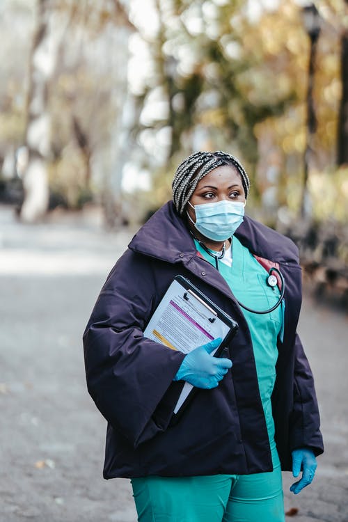 黑色和白色的盖头和蓝色外套,拿着白色打印机纸的人 · 免费素材图片