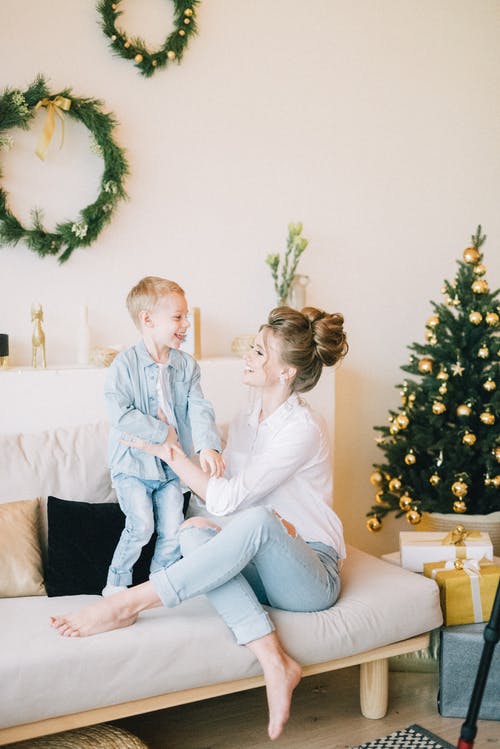 白色长袖衬衫的灰色毛衣背着孩子的女人 · 免费素材图片