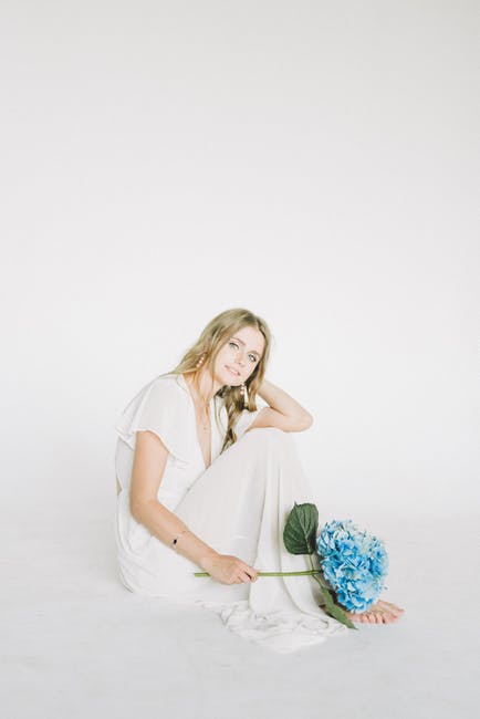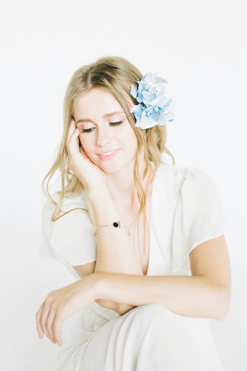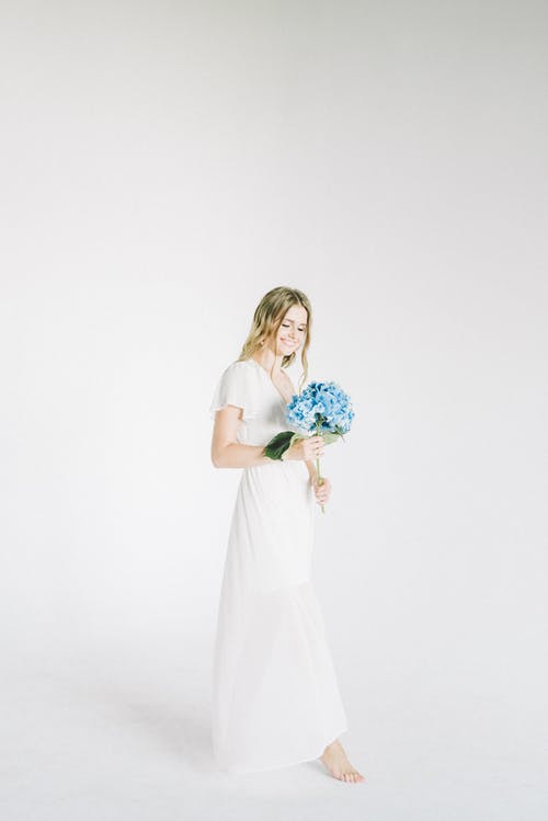 拿着蓝色花的白色礼服的妇女 · 免费素材图片