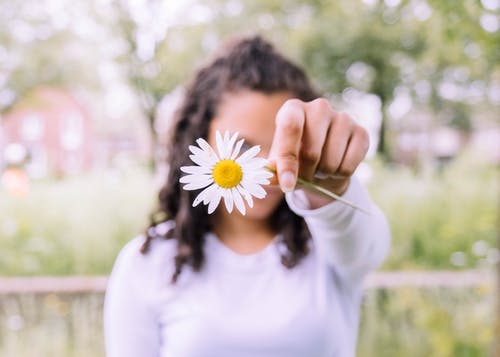 女人拿着一朵白色的雏菊花的选择性焦点照片 · 免费素材图片