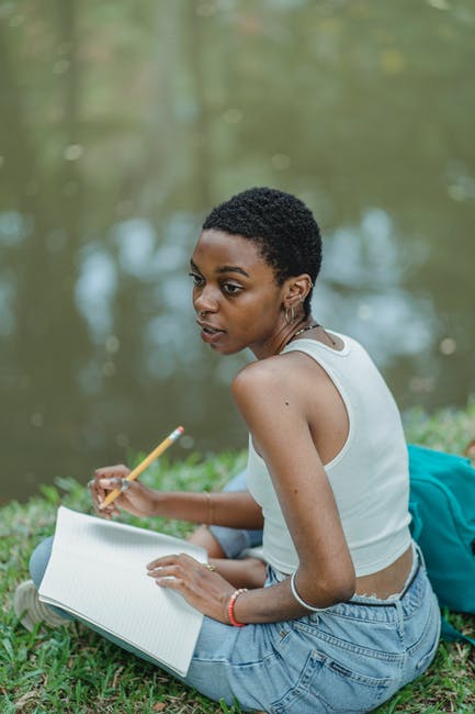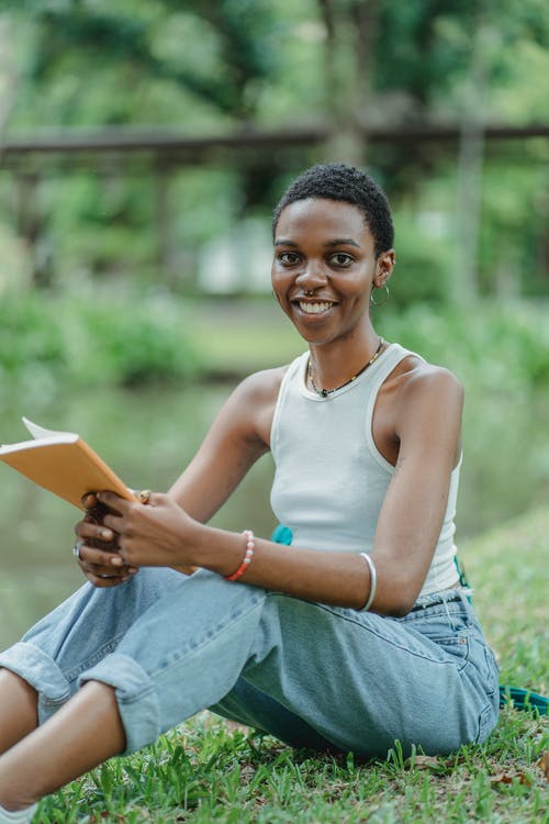 黑人女性与草绘板坐在草地上 · 免费素材图片