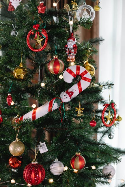 绿色圣诞树与金色的小玩意和红色和白色的条纹的拐杖糖 · 免费素材图片