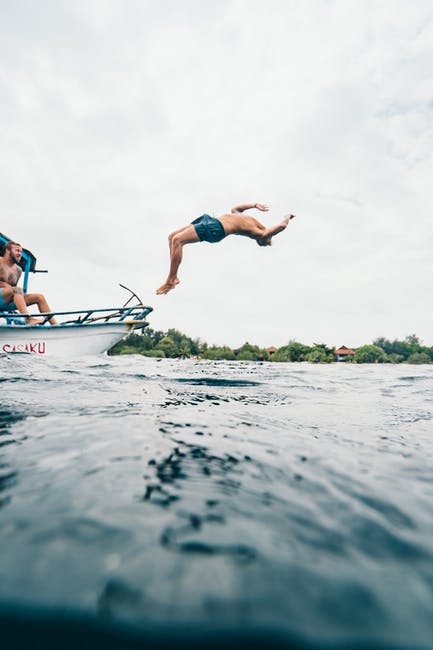 男子身穿蓝色短裤在水体表演向后翻转 · 免费素材图片