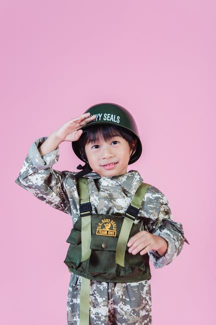 身穿黑色和红色帽子的绿色迷彩制服的男孩 · 免费素材图片