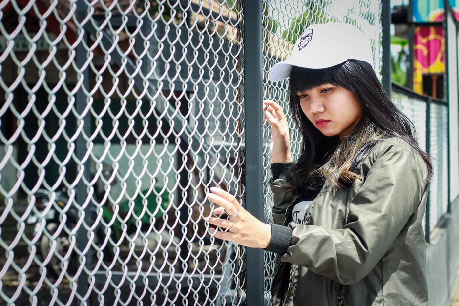 女人穿着灰色轰炸机夹克靠在灰色铁丝网附近 · 免费素材图片