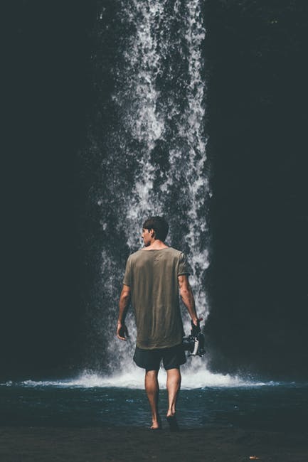 穿着灰色衬衫的男人走在瀑布附近 · 免费素材图片