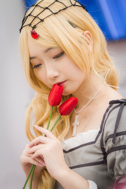 女人穿着灰色的衣服,微笑着红色的郁金香花 · 免费素材图片