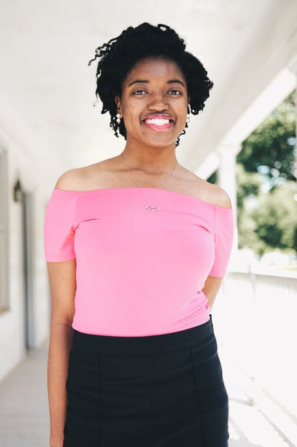 微笑的女人,穿着粉红色的露肩短袖上衣和黑色的裙子选择性聚焦照片 · 免费素材图片