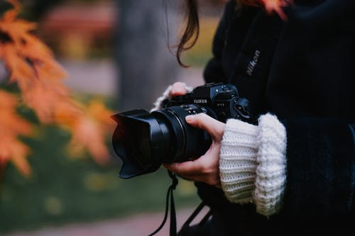 拿着黑色的数码单反相机的白色针织毛衣的女人 · 免费素材图片
