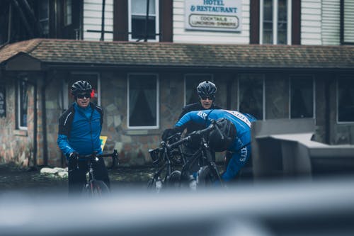 男子骑自行车在红色和灰色的大楼附近的道路上行驶 · 免费素材图片