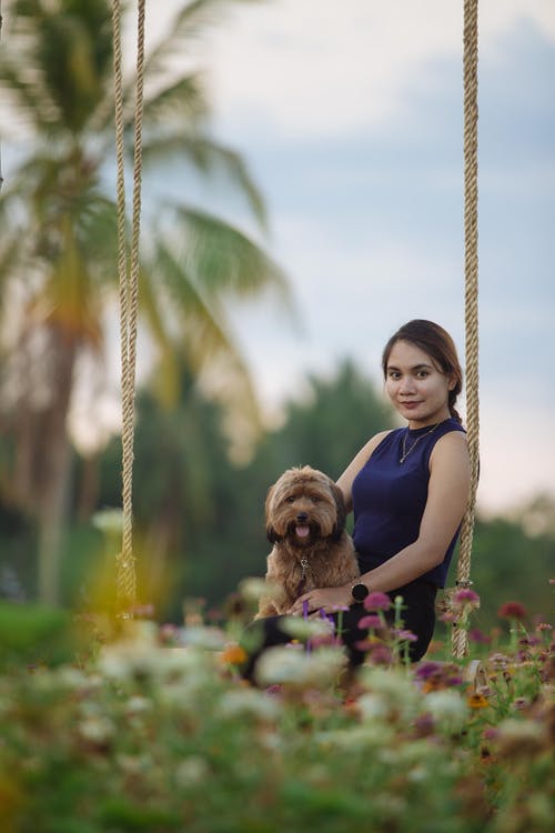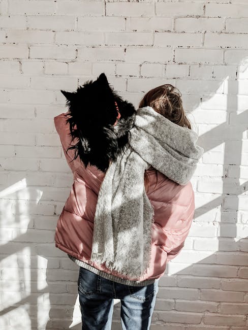 不可识别的女人拥抱狗在砖墙附近在阳光下 · 免费素材图片