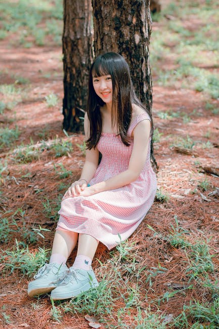 白天,女孩的粉红色无袖连衣裙坐在黑树干旁边 · 免费素材图片