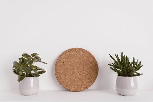 两个圆形陶瓷盆栽绿色植物和液体填充透明水杯 · 免费素材图片