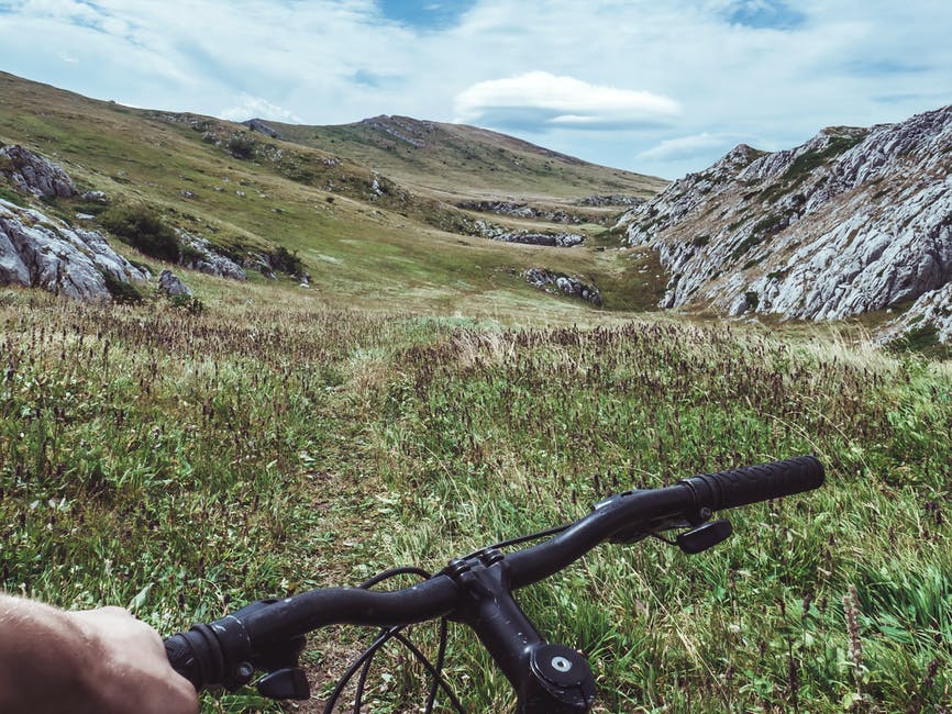 人骑自行车俯瞰绿草田和山 · 免费素材图片