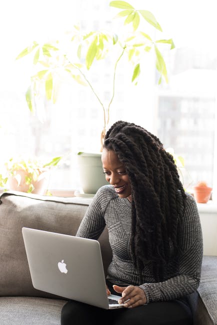 女人sittin按住她的苹果macbook空气在灰色的沙发上 · 免费素材图片